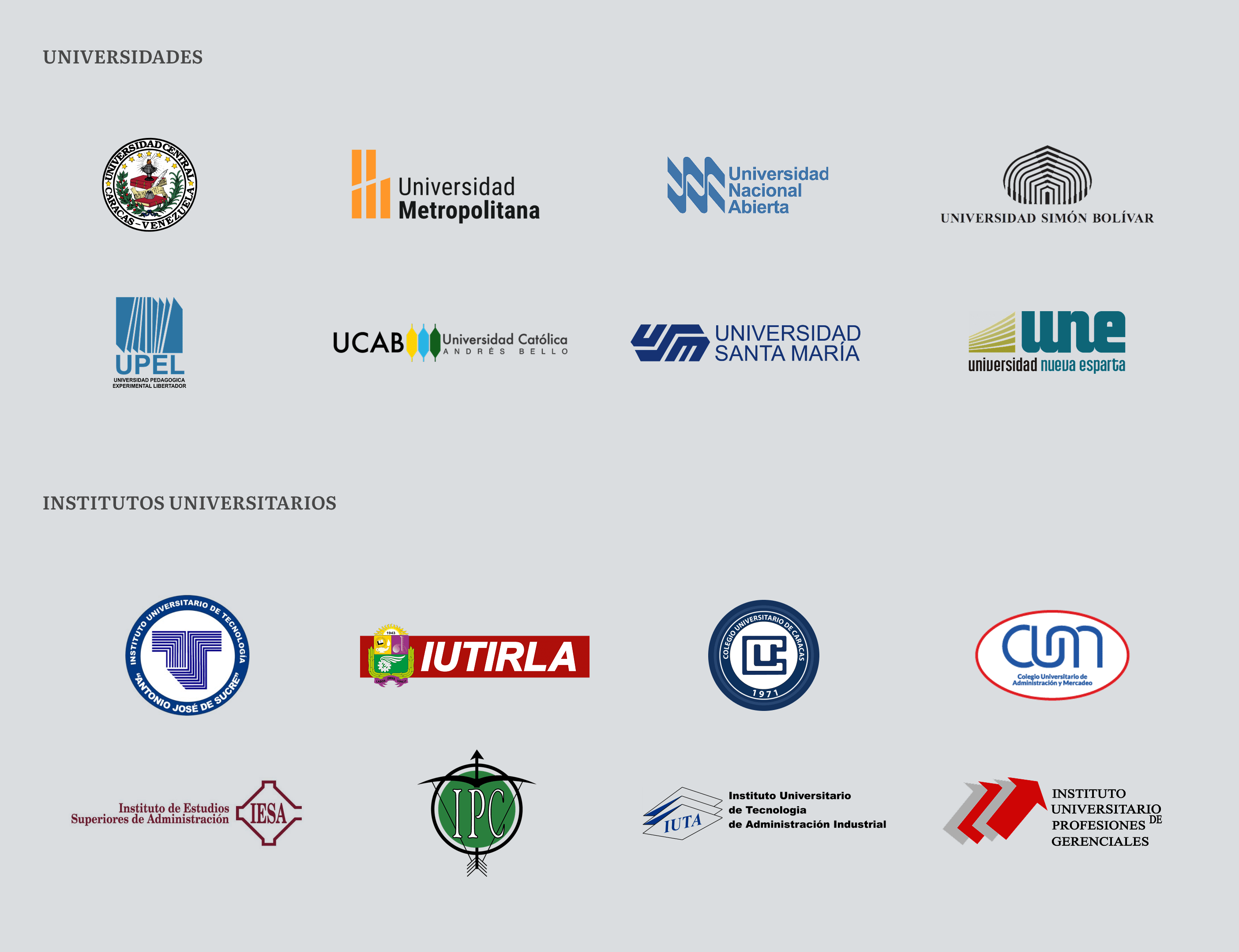 Instituciones como UCV, IUTIRLA y CUC conservan una identidad más tradicional usan logos tipo escudo o heráldicos con tipografías serif o sans serif pero siempre en mayúsculas y paletas de colores vibrantes y variadas, que conectan con la formalidad académica.